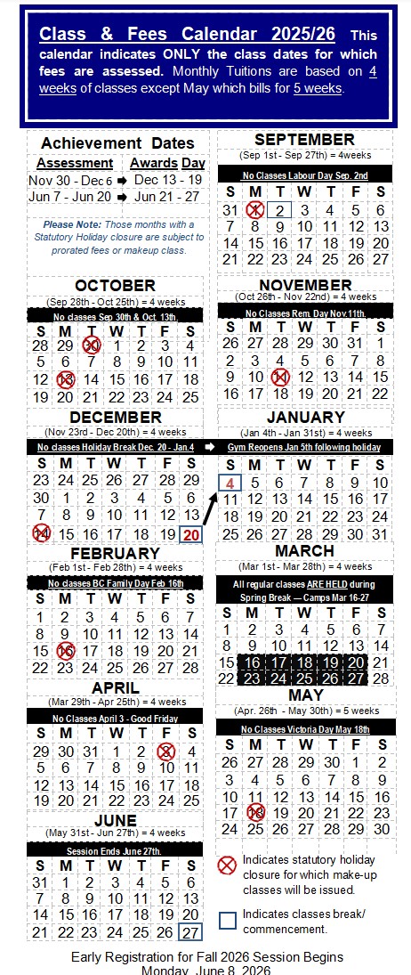 Although we generally design our class schedules around suitable times and days for students, we still run courses based on current enrollments. If the minimum amount of student required to run the class are not met one week before the start date the decision to cancel that particular class so students can choose an alternative. With an average of 500 actively registered students in attendance and waiting lists for various classes, it makes good sense to register early and avoid the disappointment of not getting the desired coach, class day and time to fit your schedule. Take advantage of our 2025 pre-registration by registering your child online with our online services.
